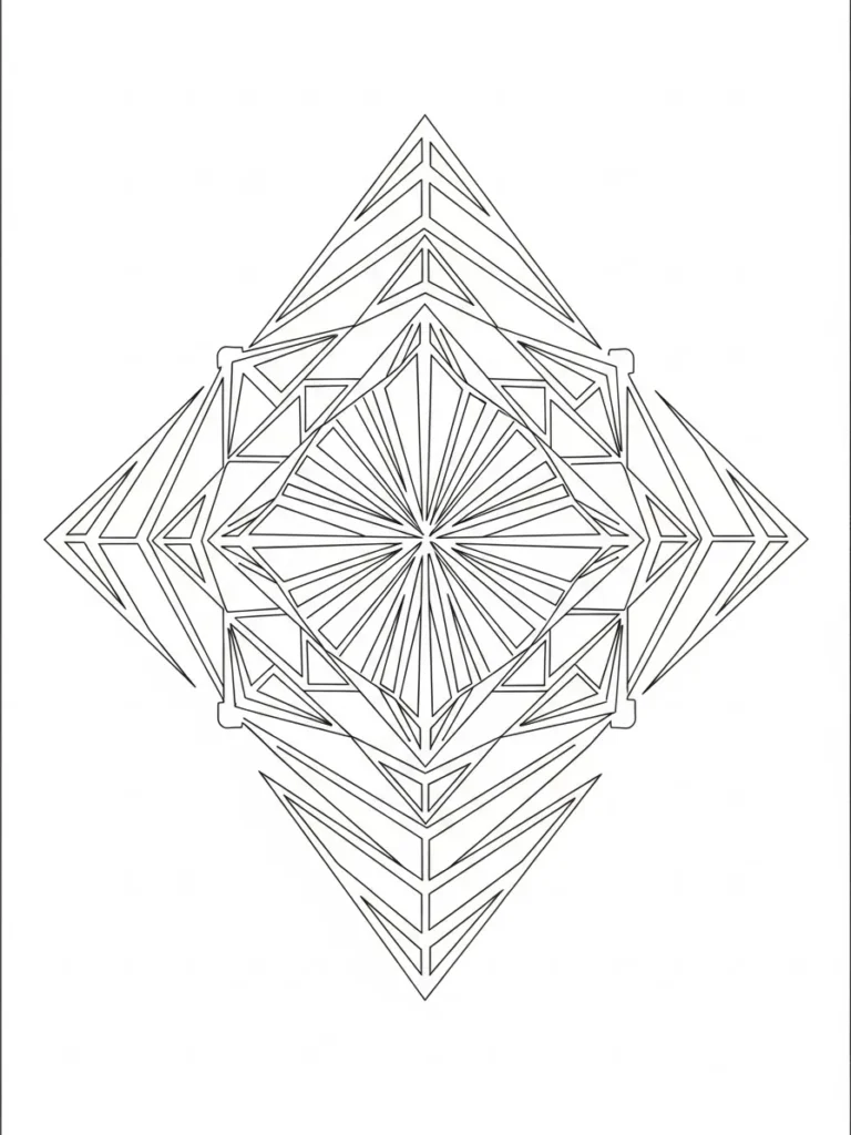 This geometric coloring page features a striking diamond shaped design with layered angular lines radiating out from a detailed central burst. Sharp triangles and chevron like segments stack outward in perfect symmetry which gives the whole piece a bold architectural feel. The line work is clean and precise with a mix of open areas and tightly packed sections that add depth and movement. The overall layout feels balanced and powerful while still leaving room for creative color play.