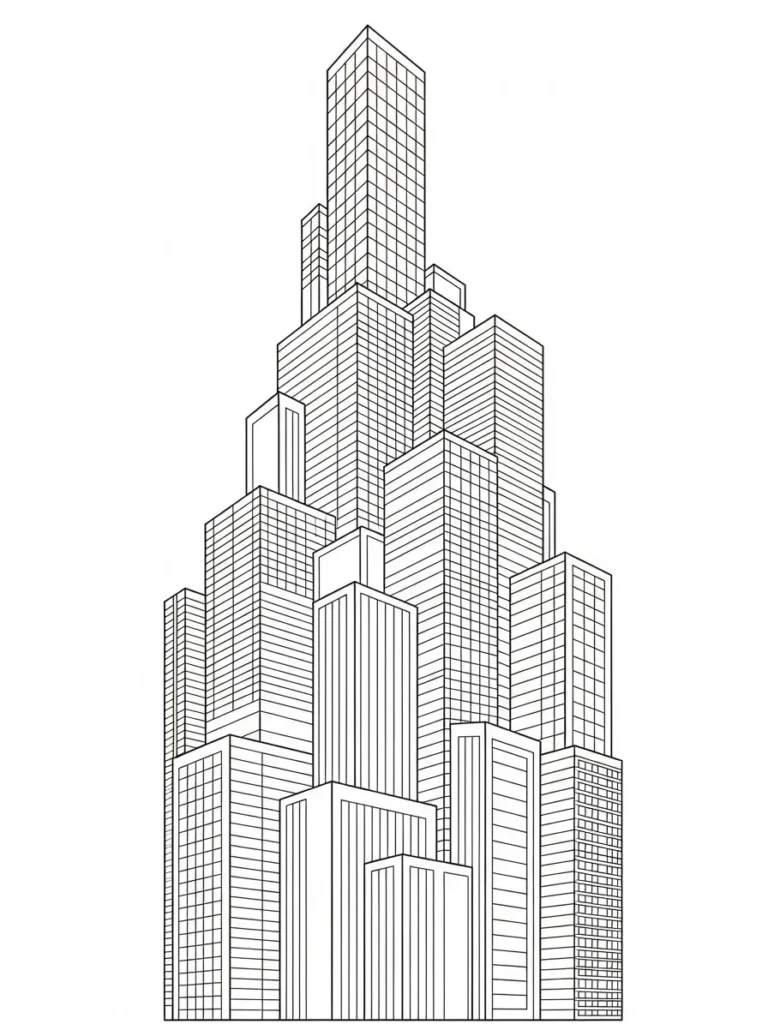 This geometric coloring page showcases a stacked skyline of tall city buildings drawn with clean straight lines and repeating window patterns. Each tower is made up of rectangles and grids that rise upward in a layered composition that feels bold and architectural. The line work is smooth and consistent which gives the whole design a sleek modern look without feeling too busy. The vertical layout naturally pulls the eye upward and makes the page feel strong and structured.