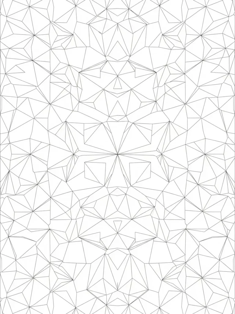 This geometric coloring page is filled with intricate triangular facets arranged in a mirrored symmetrical layout that feels like a modern kaleidoscope. Fine clean lines form sharp angles and repeating shapes that flow evenly across the entire page. The pattern feels detailed without being overwhelming and the symmetry gives it a polished almost jewel like look. Everything is tightly connected which creates a satisfying sense of structure and visual harmony.