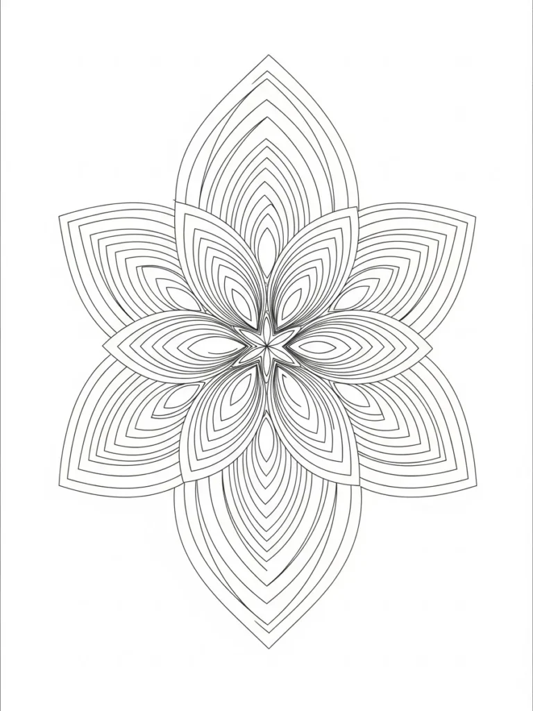 This geometric coloring page features a flower inspired mandala made from repeated petal shapes stacked in smooth concentric layers. Each petal is outlined with fine clean lines that gradually expand outward from the center creating a sense of depth and movement. The symmetry is perfectly balanced which gives the whole design a calm polished look. The open spaces between the lines make it feel airy and modern while still offering plenty of detail to enjoy.