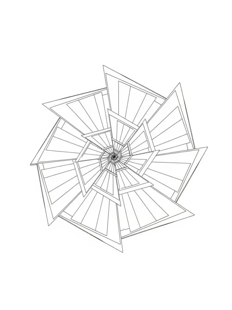 This geometric coloring page features a bold spiral design made from layered triangular panels that rotate inward toward a small detailed center. Each shape fans out with clean straight lines and consistent spacing which creates a strong sense of motion and depth. The overall layout feels dynamic and modern with plenty of open areas balanced by tighter sections near the middle. The crisp line work keeps everything sharp and satisfying to color without feeling overwhelming.