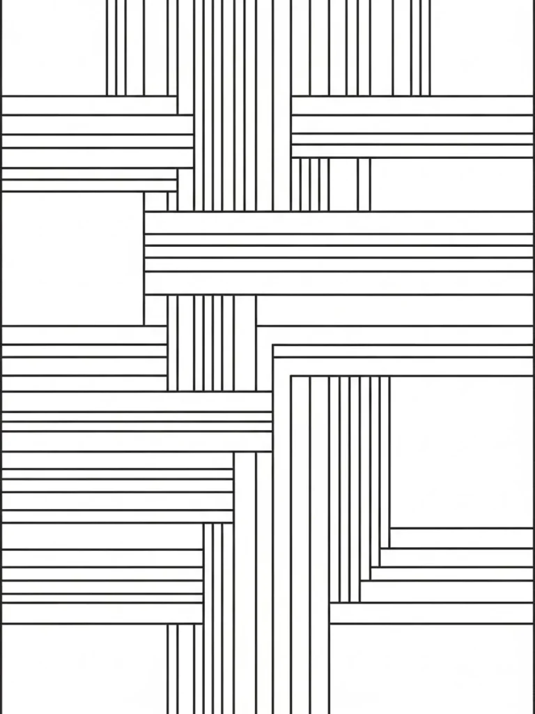 This geometric coloring page is built from thick and thin parallel lines that weave together into bold rectangular blocks. Horizontal and vertical stripes overlap and intersect which creates a layered grid that feels modern and graphic. The lines are clean and evenly spaced which gives the design a strong architectural vibe while still leaving plenty of open areas. The overall layout feels structured and balanced with just enough variation to keep it visually interesting.