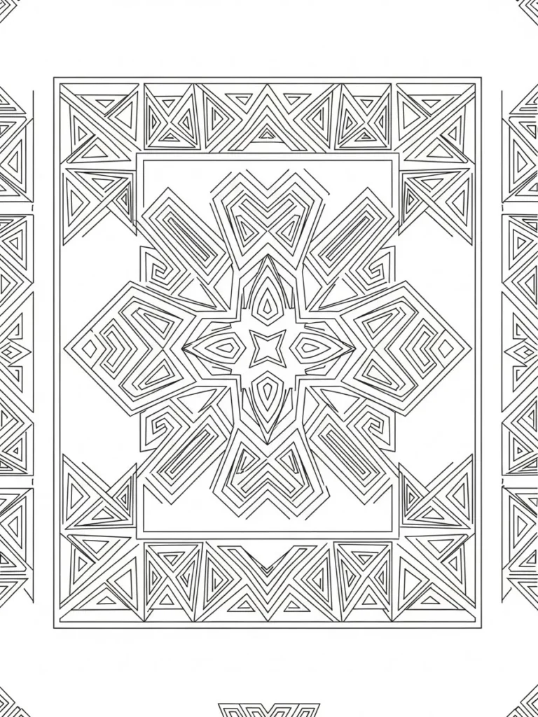 This geometric coloring page features a bold star shaped motif built from layered angular lines and repeating triangular forms. The design sits inside a structured square frame filled with detailed border patterns that add contrast and balance. Clean precise line work gives the page a strong graphic feel while still leaving plenty of open space within each section. The mix of symmetry and sharp angles creates a modern look with a subtle tribal influence.
