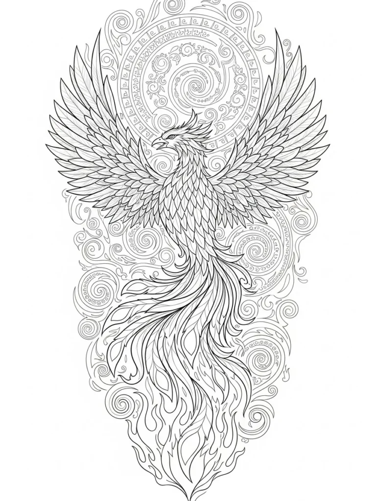 This coloring page features a powerful phoenix rising with its wings fully spread, surrounded by swirling magical patterns that feel straight out of the wizarding world. The feathers are layered with fine, flowing line work that gives the wings and tail incredible movement. Intricate curls, spirals, and circular motifs frame the phoenix, creating a balanced composition that feels both dramatic and elegant. The lines are clean and detailed without being overwhelming, making the whole design feel rich, mystical, and perfect for adult coloring.