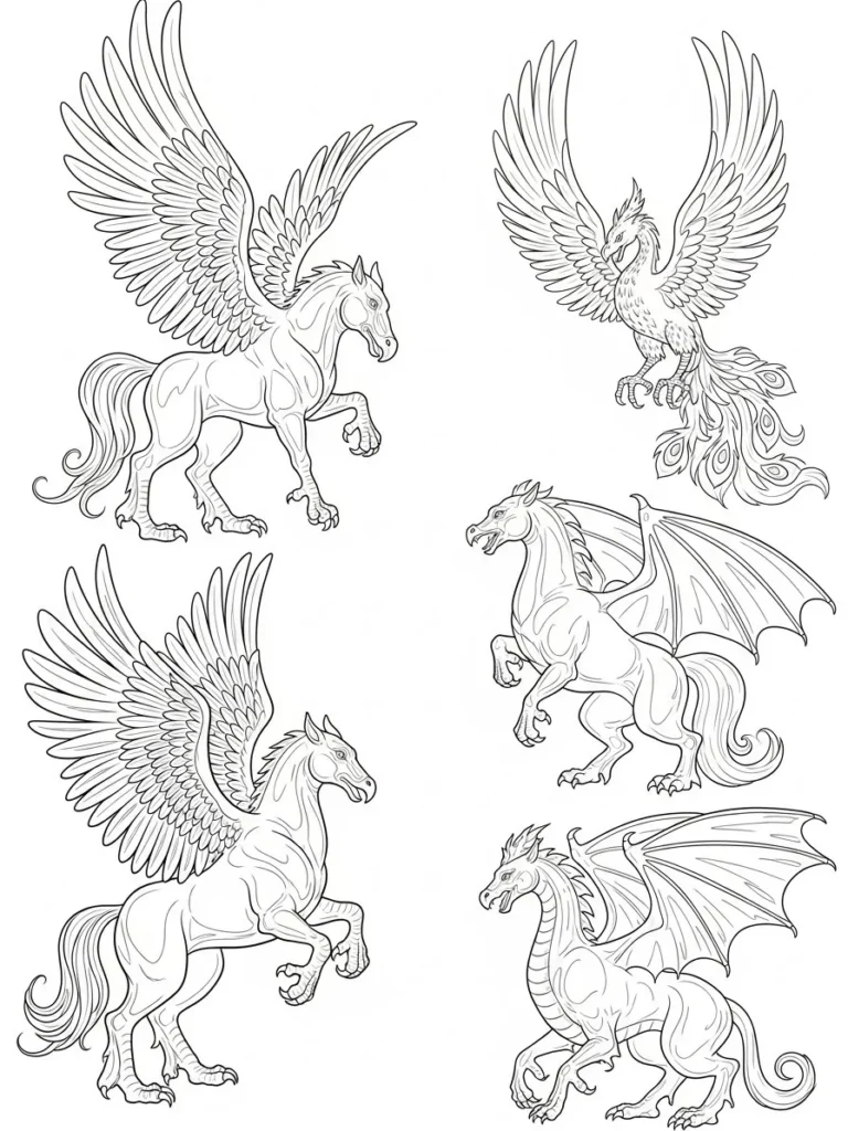 This coloring page features a collection of magical creatures arranged across the page, including winged horses, dragons, and a graceful phoenix. Each creature is drawn with elegant flowing lines that highlight feathers, wings, scales, and movement. The designs feel airy and balanced, with plenty of open space around each figure so every creature stands on its own. The line thickness is clean and smooth, making the details clear without feeling heavy or crowded.