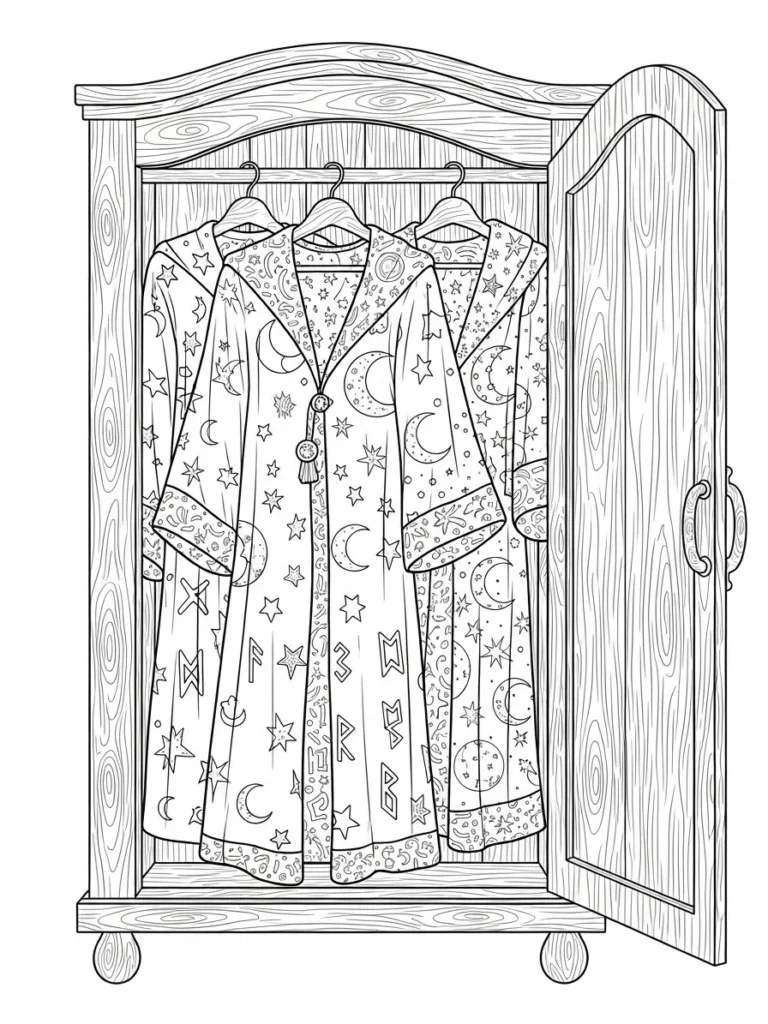 This coloring page shows a wooden wardrobe opened to reveal flowing wizard robes hanging neatly inside. Each robe is covered in stars, moons, runes, and tiny magical symbols that feel whimsical and cozy. The wood grain of the wardrobe adds texture and warmth, while the robes themselves have soft folds and layered patterns that invite careful coloring. The line work is clean and balanced, with enough detail to feel interesting without becoming too busy.