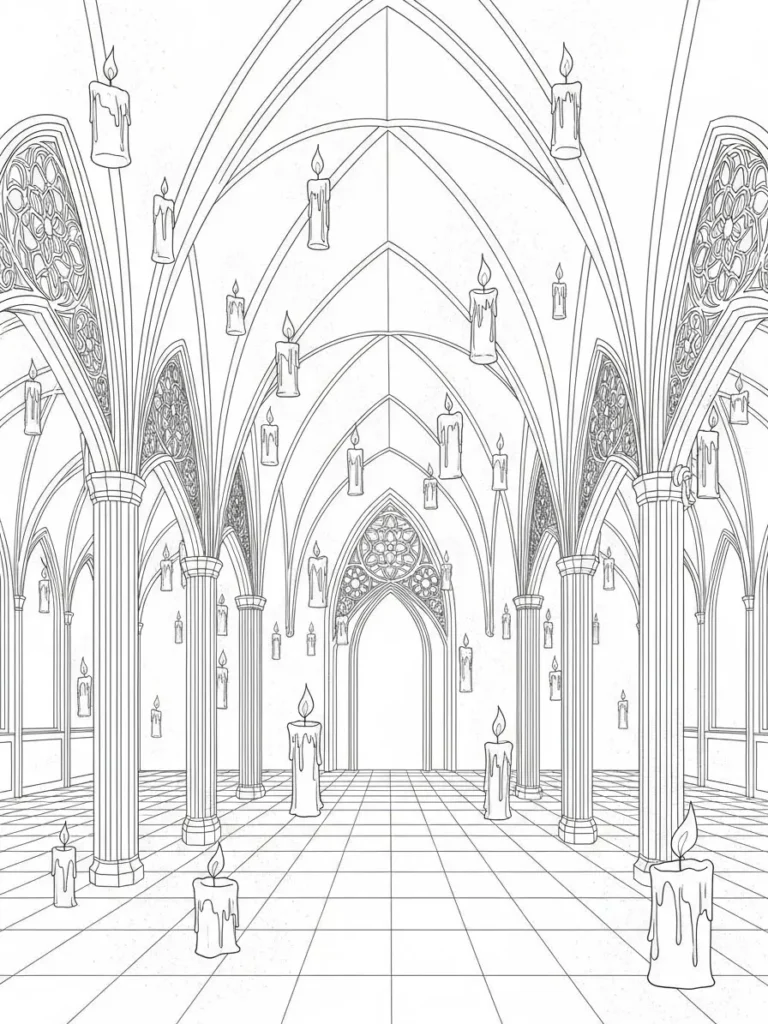 This coloring page captures a grand hall filled with tall arches, stone columns, and glowing candles floating gently in the air. The vaulted ceiling stretches upward with elegant curved lines, while detailed stained style window patterns add a touch of magic to the walls. Candles line the floor and hover above, creating a sense of depth and calm movement throughout the space. The line work is clean and precise, with repeating architectural details that feel structured yet peaceful.
