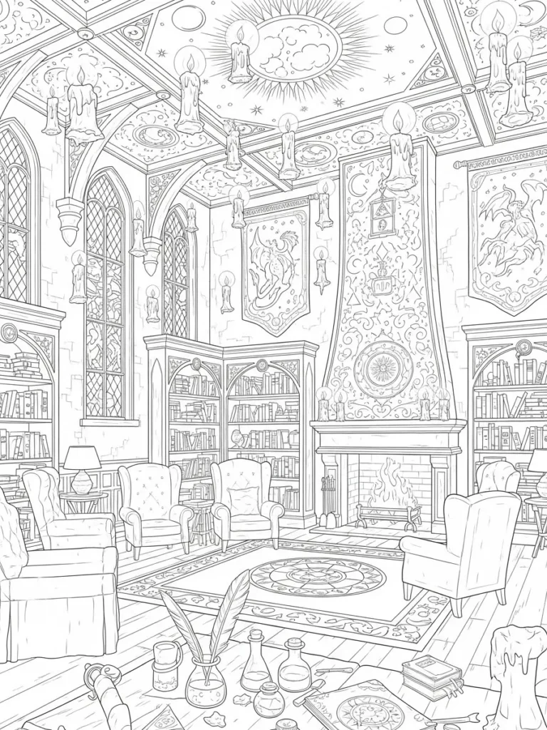 I love coloring pages like this because they feel comforting and creative at the same time. Coloring the chairs and rugs is so relaxing, and I always enjoy choosing warm cozy colors that make the space feel lived in. Some people love adding glowing effects to the candles, and I usually get carried away making the fireplace extra warm and magical. It feels like settling into a quiet wizard evening where coloring is the only thing on the schedule.