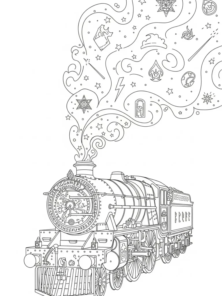I love coloring pages like this because they feel adventurous and cozy at the same time. Filling in the train is oddly satisfying, especially when I stick to rich deep colors and metallic tones. The magical steam is where I really get creative and let my imagination run wild with unexpected shades. Some people enjoy keeping it classic, and I always end up smiling because it feels like the start of a magical journey every single time.
