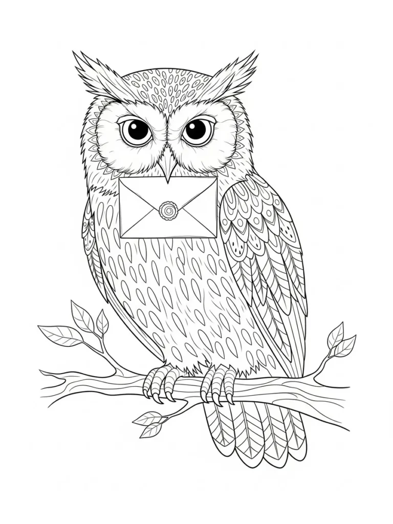 This coloring page features a wide eyed owl perched on a branch, carefully holding a sealed letter in its beak. The owl’s feathers are beautifully layered with soft patterns and gentle curves that give it a cozy, friendly look. Large expressive eyes take center stage, while the wings and tail feathers offer plenty of detail for careful shading. The clean smooth line work keeps everything clear and balanced, making the design feel calm and inviting.
