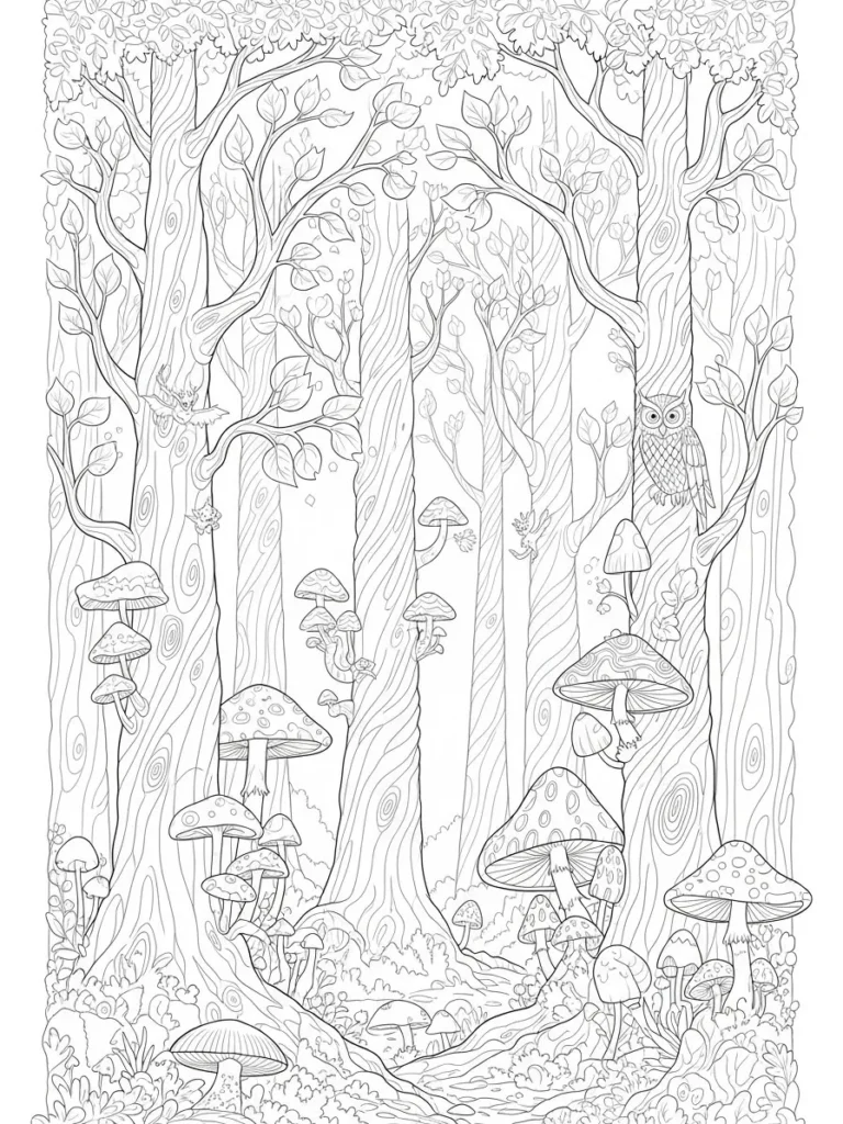 This coloring page shows a peaceful enchanted forest filled with tall twisting trees and clusters of whimsical mushrooms growing along the forest floor. The tree trunks are decorated with flowing wood grain patterns and leafy branches that create a natural frame around the scene. Tucked among the trees are small magical details like an owl watching quietly and tiny creatures peeking out, giving the forest a secretive storybook feel. The line work is delicate and detailed, with lots of organic shapes that guide the eye gently through the scene.
