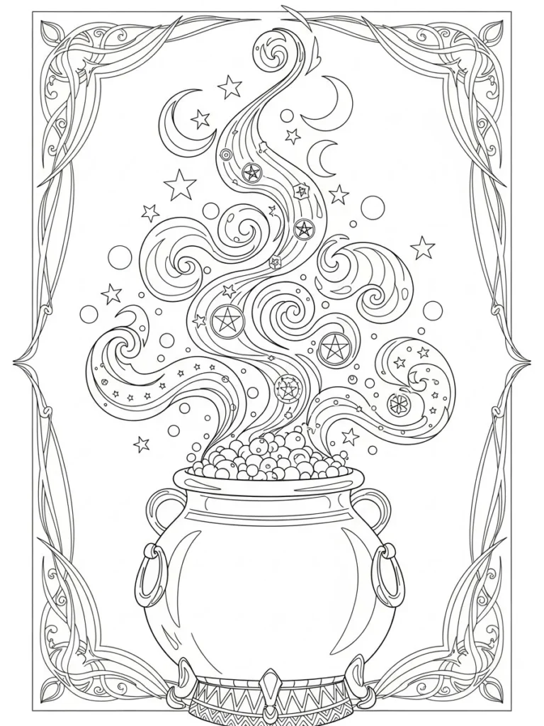 This coloring page centers around a rounded cauldron overflowing with magical energy that twists upward in elegant swirling patterns. Stars, moons, spell symbols, and glowing orbs float through the steam, creating a sense of movement and wonder. The cauldron itself is sturdy and simple, which contrasts beautifully with the flowing magic above it. An ornate border frames the entire design with curved botanical details, giving the page a balanced and enchanting layout. The line work is clean and smooth, with plenty of open space mixed with fine details for a satisfying coloring experience.