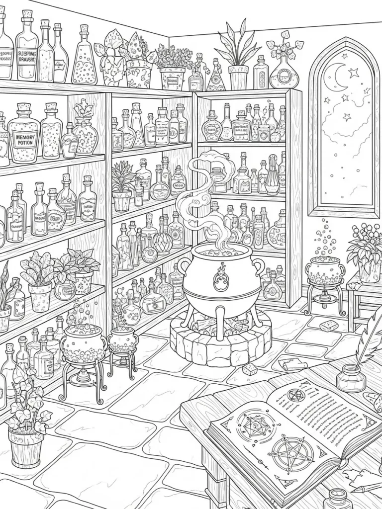 This coloring page shows a cozy potion classroom packed with shelves full of bottles, plants, and curious ingredients. A bubbling cauldron sits at the center of the room with steam curling upward, while labeled potion jars and flasks line the walls from floor to ceiling. A large open spellbook rests on the table in the foreground, adding even more detail and charm. The line work is fine and detailed, especially in the shelves and bottles, while the room layout feels balanced and inviting rather than overwhelming.