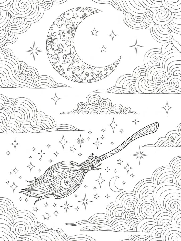 This coloring page shows a magical broom gliding through a dreamy night sky filled with swirling clouds, stars, and a glowing crescent moon. The broom bristles are decorated with tiny celestial details, while the handle curves gently as if caught in motion. Soft cloud patterns frame the scene from all sides, creating a floating layered effect that feels calm and whimsical. The line work is smooth and flowing, with a lovely mix of open spaces and delicate details that make the design feel light and magical.