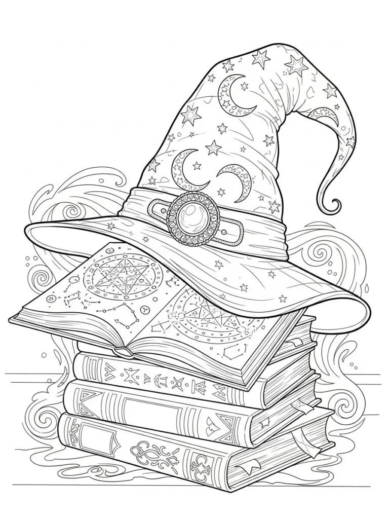 This coloring page shows a classic wizard hat gently resting on a stack of old spellbooks, surrounded by soft swirling magic. The hat is decorated with moons and stars, with smooth folds that add depth and movement. Below it, the open book reveals detailed magical symbols, constellations, and geometric spell patterns that feel mysterious and thoughtful. The stacked books underneath feature ornate covers and tiny symbols, all drawn with clean, medium fine lines that give plenty of space for careful coloring without feeling cluttered.