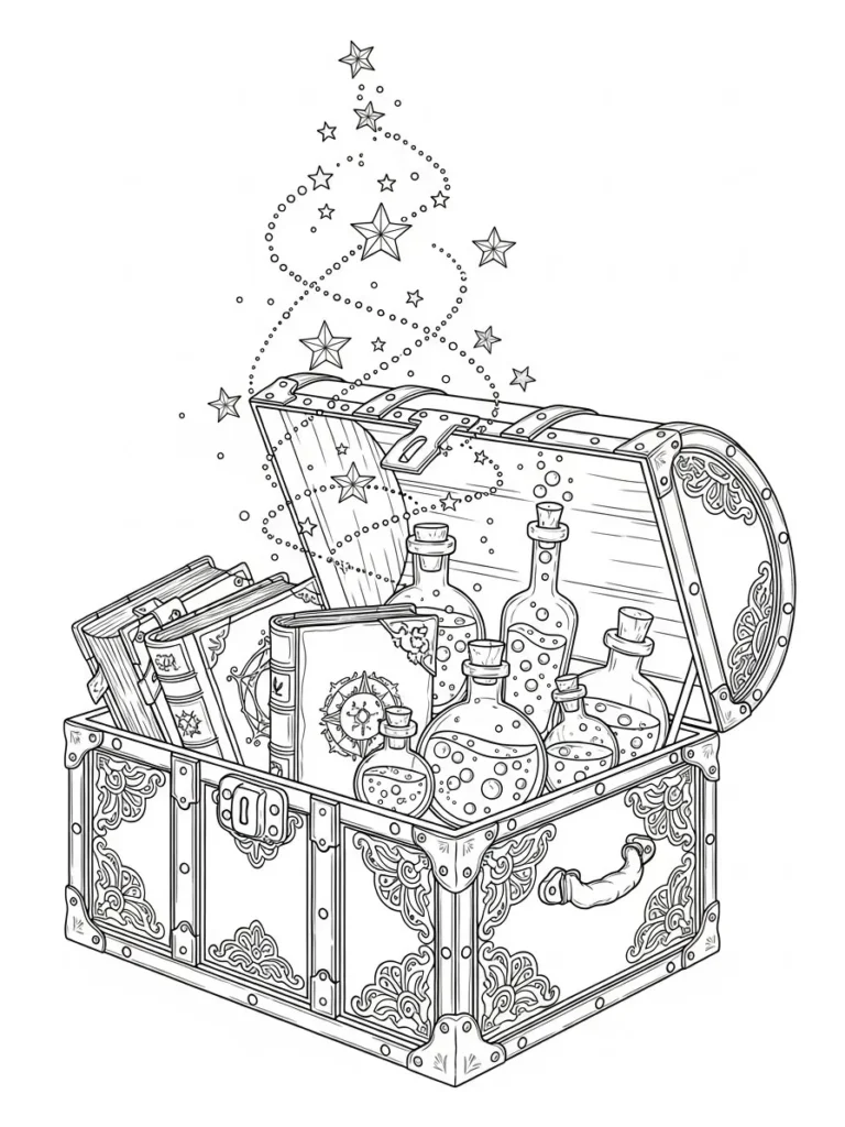 This coloring page features an open magical trunk overflowing with potion bottles, spellbooks, and glowing starry magic drifting upward. The chest itself is decorated with ornate panels, tiny scrollwork details, and bold edges that frame the scene beautifully. Inside, rounded glass bottles with bubbles and cork tops mix with stacked books covered in mystical symbols and patterns. Floating stars and dotted trails add a sense of motion and wonder, while the clean medium fine lines keep everything crisp and satisfying to color.