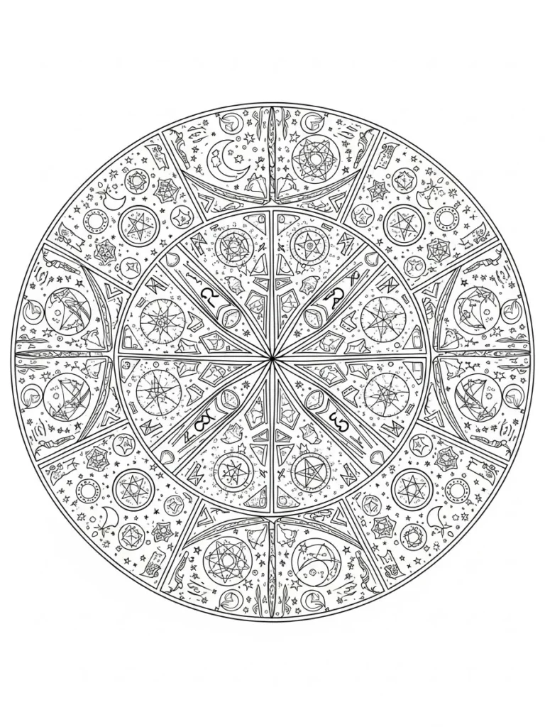 This coloring page is designed as a large circular spell wheel filled with tiny magical symbols and celestial details. Each section of the circle is divided like a wheel, with moons, stars, runes, crystals, and geometric spell markings carefully placed throughout. The layout feels balanced and symmetrical, which makes it visually soothing right from the start. Fine clean lines keep every symbol crisp, while the repeating patterns give the page a detailed mandala style look that feels very wizard inspired.