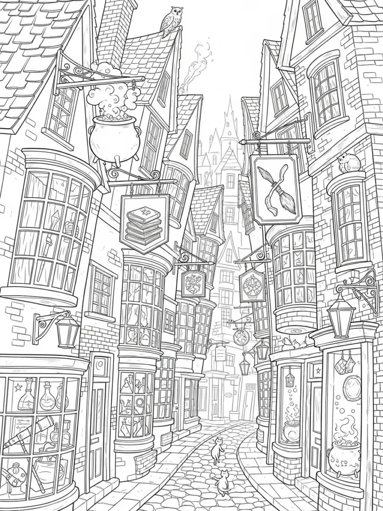 This coloring page captures a narrow magical street lined with tall crooked buildings full of character and charm. Shop windows are packed with potion bottles, spell tools, and mysterious objects, while hanging signs show symbols like books, brooms, and cauldrons. Brick textures, curved windows, and angled rooftops give the whole scene a playful uneven look that feels wonderfully magical. The line work is detailed but clean, with plenty of small areas for coloring alongside larger sections that help the scene breathe.