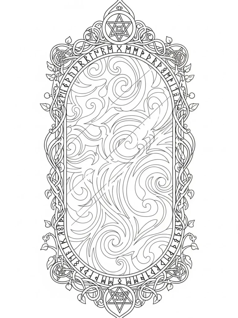 This coloring page features a tall oval mirror framed with twisting vines, runic symbols, and flowing magical lines. The border is packed with intricate knotwork, leaves, and arcane markings that wrap around the mirror like protective magic. At the top and bottom, geometric star symbols add a strong wizarding touch, while the center remains filled with soft swirling patterns that feel almost alive. The line work is fine and elegant, giving the whole design a graceful balance between detailed borders and a calmer inner space.