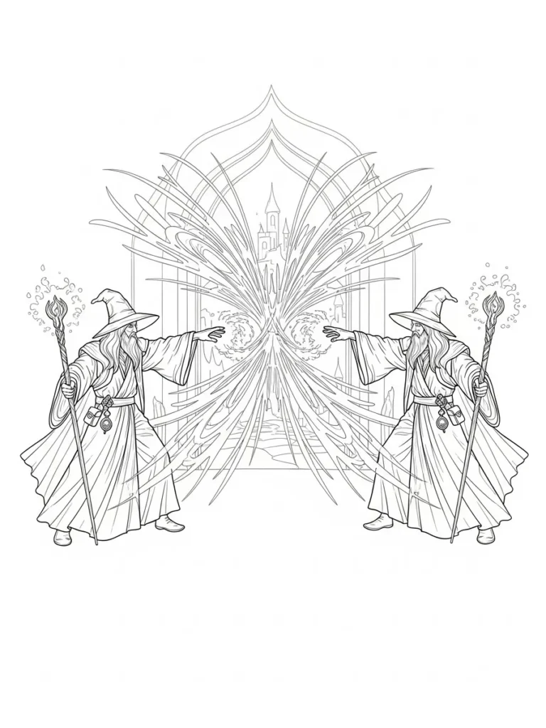 This coloring page shows two wise wizards standing on opposite sides, mirroring each other as they cast a powerful spell toward the center. Flowing magical energy bursts outward in elegant curved lines, creating a dramatic symmetrical shape that feels alive and intense. The wizards wear long robes with soft folds and hold glowing staffs, while an arched doorway and distant castle details rise behind them. The line work is fine and graceful, with a strong balance between detailed figures and sweeping magical patterns that pull your eye inward.