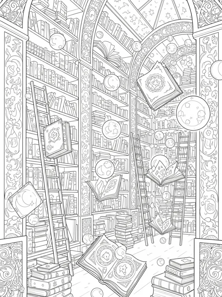 This coloring page shows a towering magical library filled with endless shelves of spellbooks stretching up toward a vaulted ceiling. Ladders lean against the shelves, stacks of books sit on the floor, and open tomes float gently through the air as glowing orbs drift around them. Ornate arches and decorative patterns frame the scene, giving it a grand and cozy wizard library feel at the same time. The fine detailed line work captures every book spine and swirling accent without feeling heavy, which makes the whole layout feel rich and immersive.
