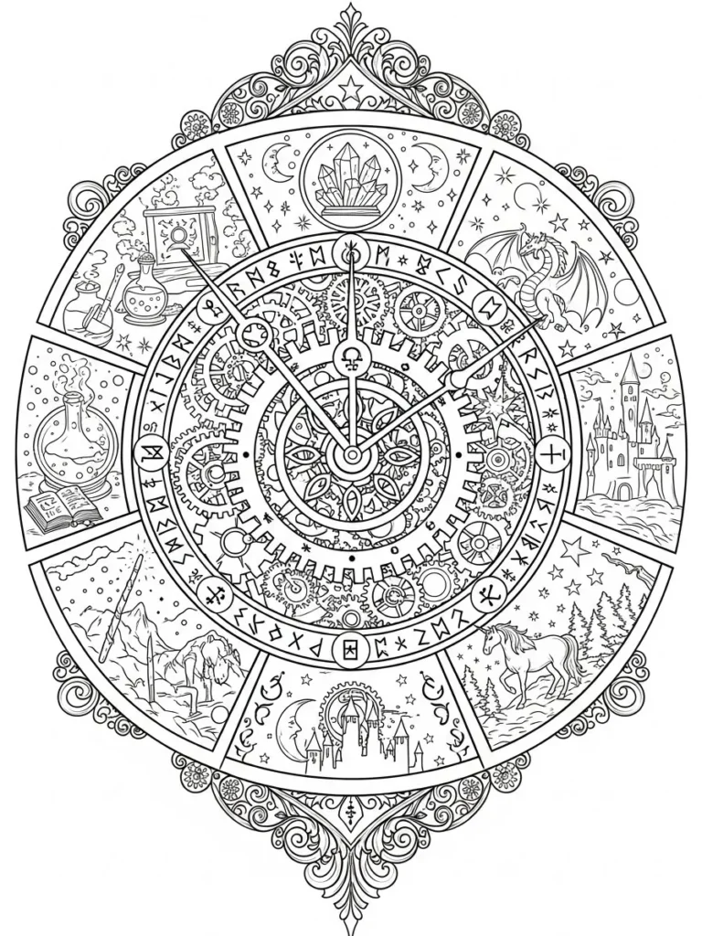 This coloring page features an ornate circular clock filled with layers of magical details and storytelling scenes. Gears, runes, and clock hands sit at the center, surrounded by illustrated sections showing crystals, potions, dragons, castles, forests, and spell tools. Each slice of the circle feels like its own tiny world, all framed by elegant swirling borders and decorative flourishes. The line work is fine and precise, with lots of tiny elements balanced by larger shapes that keep the design structured and satisfying to color.