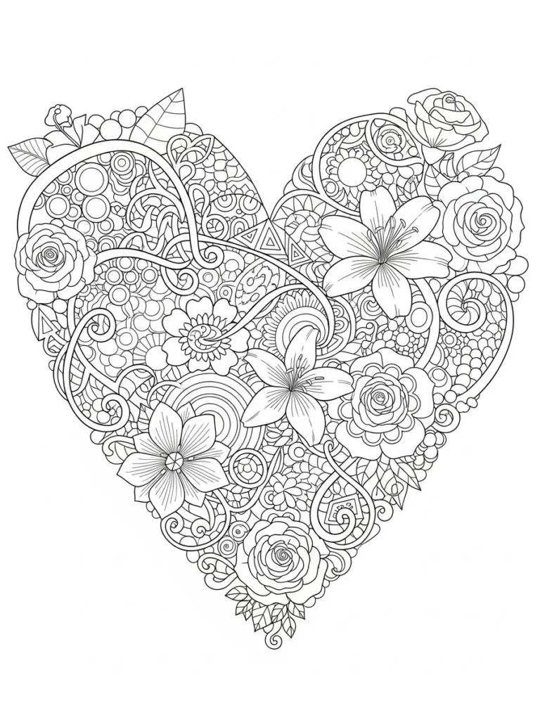 This heart shaped coloring page is packed with flowing floral details and playful patterns that fill every inch of the design. Soft roses and open blooms are layered with curling vines, looping swirls, tiny circles, and geometric accents that weave everything together into one cohesive heart. The line work is clean and medium fine, making it detailed without feeling overwhelming. The layout feels balanced and organic, with flowers anchoring the shape while the abstract patterns add movement and charm throughout.