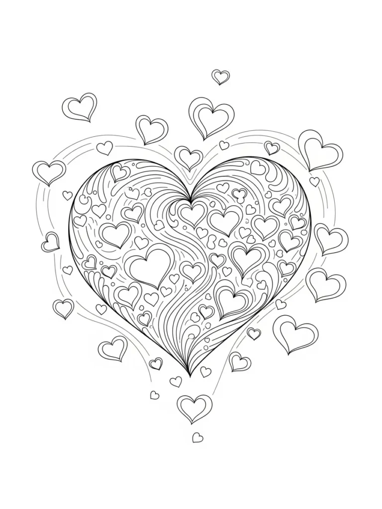 This heart shaped coloring page features a central heart packed with tiny layered hearts, surrounded by flowing swirls and scattered love shapes that seem to float freely around it. Curved lines stretch outward like ribbons, adding movement and a light whimsical feel to the design. The line work is clean and slightly varied, giving the page a hand drawn charm that feels lively without being messy. The overall layout feels open and joyful, with plenty of breathing room between details.