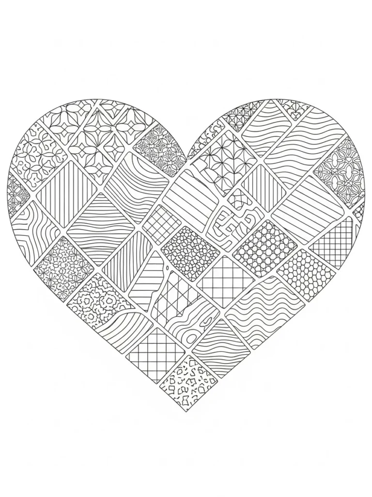 This heart shaped coloring page is made up of small patchwork style sections, each filled with its own unique pattern. Stripes, waves, grids, florals, and textured doodles come together to form a structured but playful heart shape. The line work is neat and consistent, giving each little section clear boundaries that make coloring feel organized and approachable. The overall layout has a quilt like charm that feels both creative and comforting.