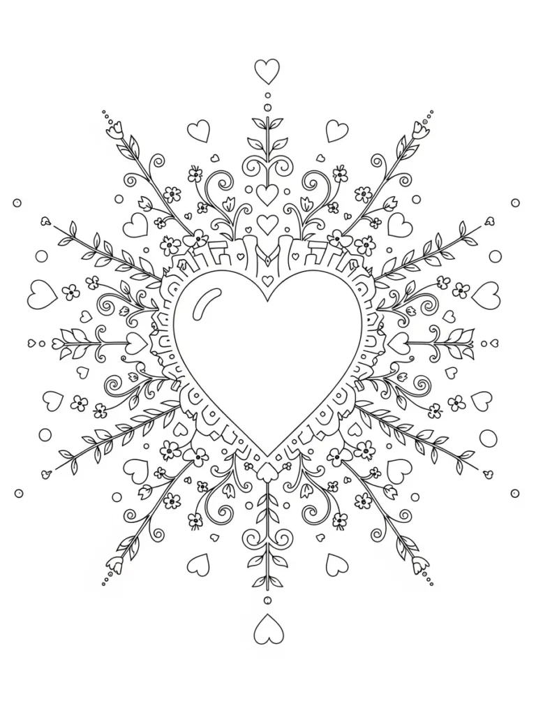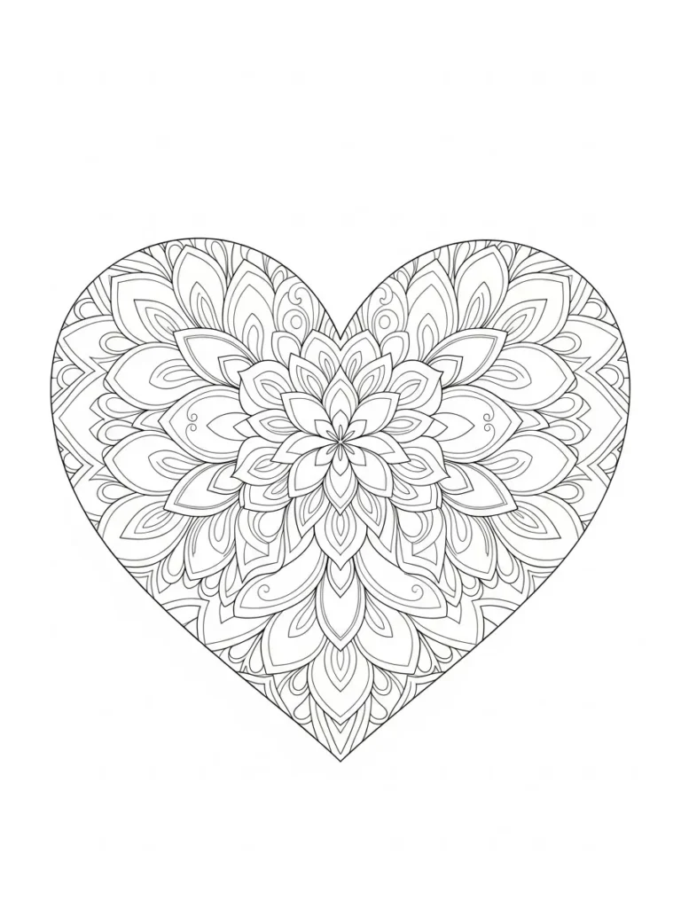 This heart shaped coloring page features a detailed mandala design built from layered petals and repeating floral shapes that radiate outward from the center. Each section flows smoothly into the next, creating a rich sense of depth and symmetry throughout the heart. The line work is fine and consistent, giving the design an intricate look while keeping every shape clear and well defined. The overall layout feels full and balanced, with decorative details filling the heart edge to edge.
