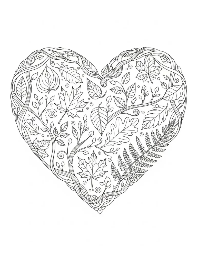 This heart shaped coloring page is filled with delicate leaves, curling vines, and gentle botanical details that weave together naturally. Different leaf shapes add texture and variety, from soft rounded leaves to fern like fronds and maple inspired silhouettes. Flowing lines wrap around the heart and create movement, while the line thickness stays clean and even for easy coloring. The overall layout feels organic and balanced, like a little piece of nature shaped into a heart.
