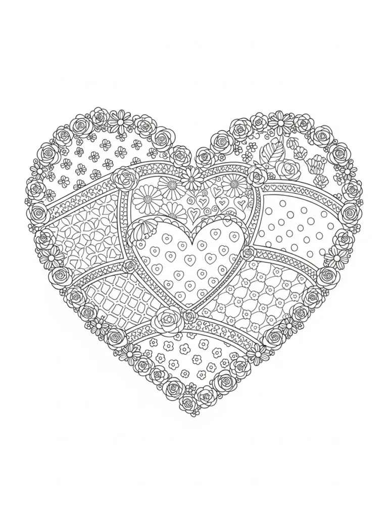 This heart shaped coloring page combines a cozy patchwork layout with romantic floral details all around the edge. Inside the heart, different sections are filled with playful patterns like dots, tiny flowers, lattice shapes, and sweet mini hearts. A smaller heart sits in the center as a focal point, while roses and blossoms form a detailed border that wraps the entire design together. The line work is clean and fine, giving the page lots of detail while keeping each section clear and easy to color.