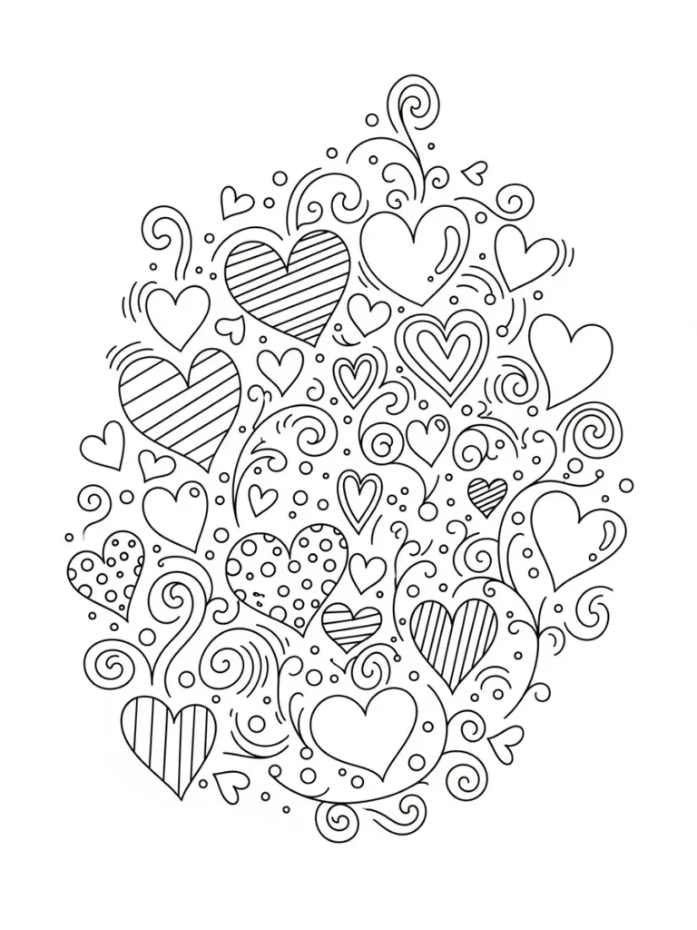 This heart themed coloring page feels like a joyful doodle explosion filled with hearts of all sizes, curly swirls, dots, and fun little accents. Striped hearts mix with solid outlines and polka dot details, giving the design a lively hand drawn look. The line work is slightly varied, which adds to the playful charm and keeps everything feeling loose and creative. The overall layout feels energetic and light, with shapes floating freely instead of being locked into a strict structure.