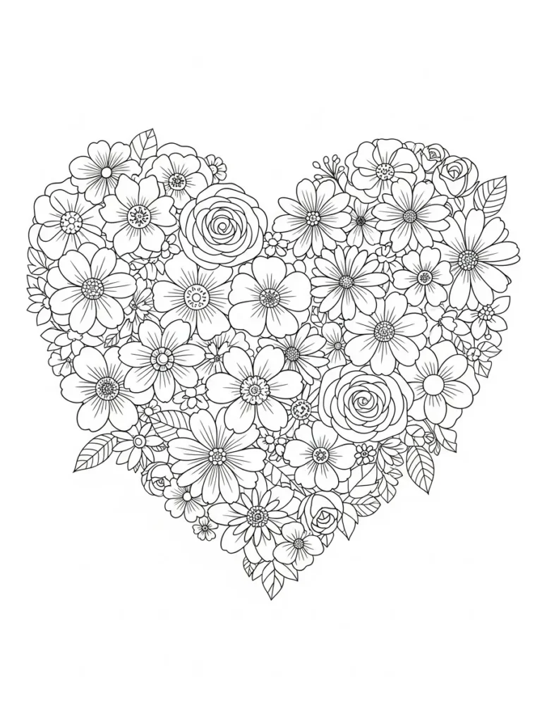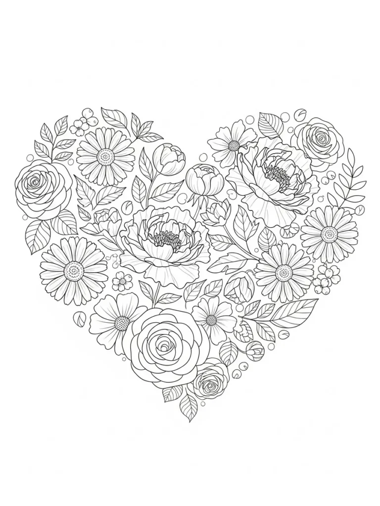 This heart shaped coloring page is filled with a beautiful mix of blooming flowers and leafy accents arranged in a loose garden style layout. Roses, daisies, and open blossoms overlap gently, creating depth while keeping the overall design light and airy. The line work is clean and slightly fine, giving each petal and leaf plenty of detail without feeling overwhelming. Small circular accents add a playful touch and help balance the composition throughout the heart.