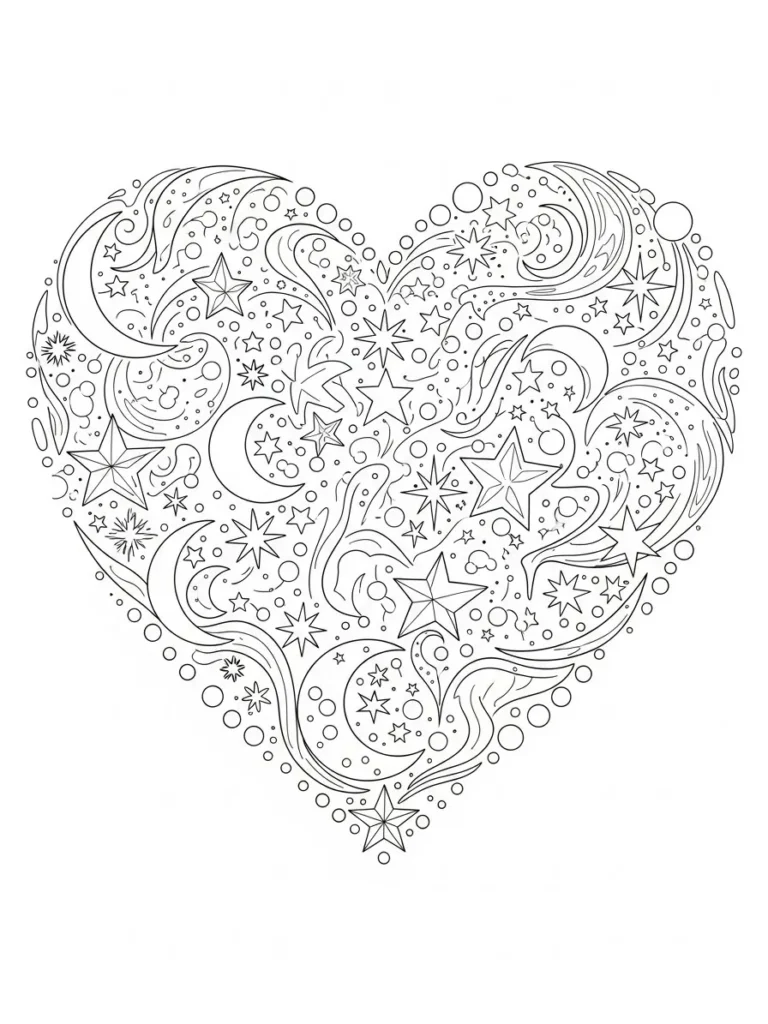 This heart shaped coloring page is packed with dreamy celestial details like crescent moons, twinkling stars, flowing clouds, and swirling night sky patterns. Tiny dots and curved lines fill the background, giving the whole design a magical sense of movement and depth. The line work is fine and detailed, making it perfect for slow and mindful coloring. Everything flows together naturally, creating a cosmic heart that feels both playful and soothing.