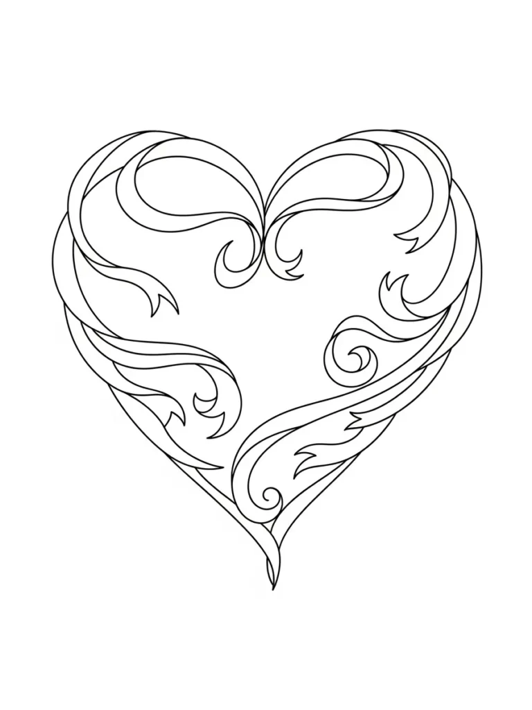 This heart shaped coloring page features smooth sweeping lines that curl and flow like soft flames or gentle ribbons. The design is open and elegant, with curved strokes wrapping around the heart and meeting in delicate spirals. Line thickness is clean and slightly bold, which gives the heart a confident outline while keeping the inner details simple and airy. The overall layout feels balanced and modern, with plenty of open space that lets the curves really shine.