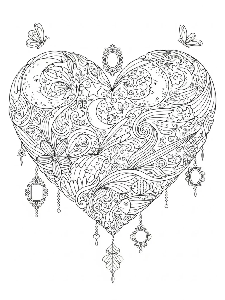 This heart shaped coloring page blends a romantic feel with celestial charm through flowing lines and imaginative details. Two crescent moons with gentle faces mirror each other inside the heart, surrounded by stars, feathers, leaves, and swirling patterns that move smoothly from one section to the next. Delicate hanging charms and butterfly accents add a whimsical touch, while the line work stays fine and consistent for an intricate adult friendly design. The overall layout feels balanced and airy, with lots of small spaces that invite careful coloring.