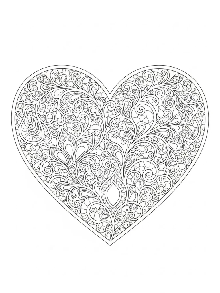 This heart shaped coloring page is filled edge to edge with delicate vine work, curling leaves, and ornate filigree details that feel both romantic and refined. The design is symmetrical yet organic, with flowing lines branching outward and weaving together into a rich decorative pattern. Fine line work creates lots of small sections to color, while the clear heart outline keeps everything feeling balanced and polished. The overall layout feels detailed and graceful without looking cluttered.