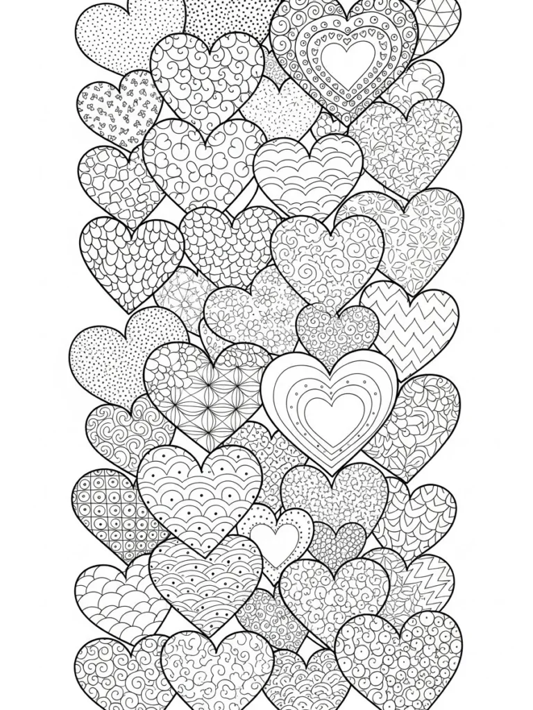This coloring page features a tall cascade of overlapping hearts stacked closely together, each one filled with its own unique pattern. You will find swirls, dots, scales, waves, florals, zigzags, and geometric textures layered from top to bottom. The line work is clean and consistent, giving every heart a clear outline while letting the interior patterns shine. The overall layout feels full and cozy, like a patchwork of love shapes flowing downward in a playful rhythm.