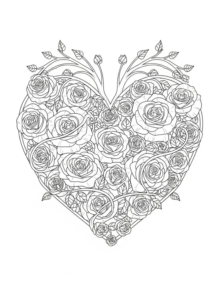 This heart shaped coloring page is completely filled with blooming roses, layered petals, and graceful curling vines that weave everything together. The flowers vary in size, creating depth and visual interest, while delicate leaves and stems fill the spaces between blooms. The line work is clean and moderately fine, giving the roses plenty of detail without feeling too heavy. The overall layout feels lush and full, like a floral arrangement shaped perfectly into a heart.