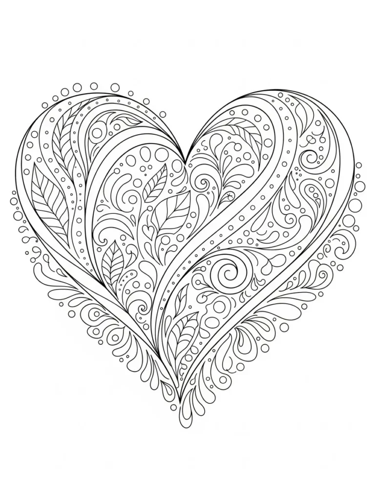 This heart shaped coloring page features graceful curves filled with leafy branches, gentle swirls, and tiny dotted accents that give it a light and airy feel. The design flows beautifully from top to bottom, with mirrored sections that keep the heart balanced while still feeling organic. Line thickness stays smooth and even, making the details clear without being too intense. Open spaces mix with fine patterns, which makes the whole heart feel calm, elegant, and easy to enjoy at your own pace.