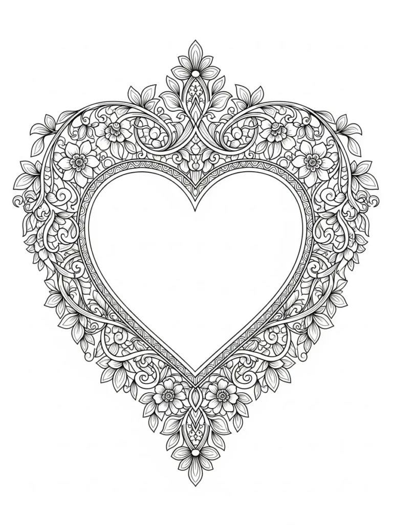 This heart shaped coloring page features an elegant open center framed by detailed florals, curling vines, and symmetrical decorative accents. The border is filled with blooming flowers, layered leaves, and soft scrollwork that wraps smoothly around the heart shape. Fine and consistent line work gives the design a refined look while still offering plenty of small sections to color. The balanced layout feels classic and romantic, with the empty center creating a lovely focal point that makes the whole design feel light and intentional.