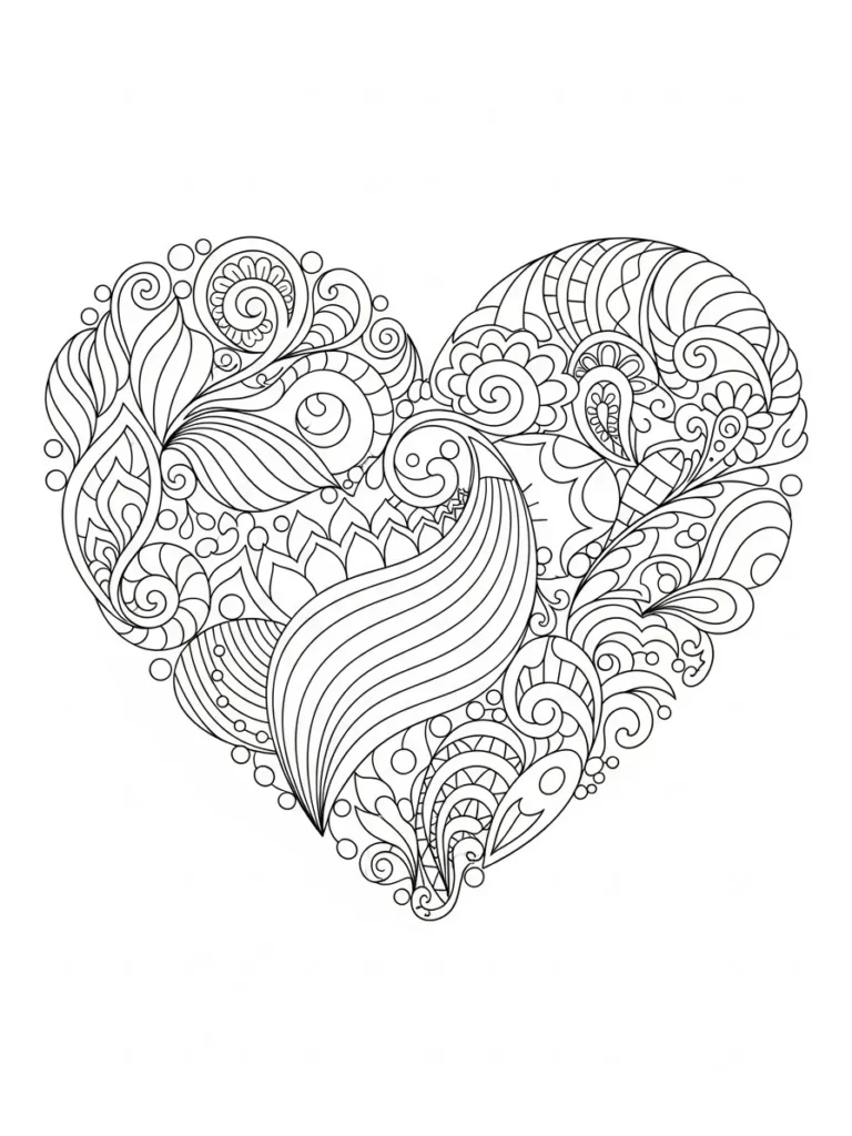 This heart shaped coloring page is filled with flowing abstract shapes, curling swirls, and layered patterns that move smoothly across the design. Leaf inspired forms, rounded dots, and wavy lines blend together in an almost doodle like style that feels fun and creative. The line work stays clean and even, with a mix of open spaces and detailed sections that keep the heart visually interesting. Everything feels connected and fluid, giving the whole design a light and playful rhythm.