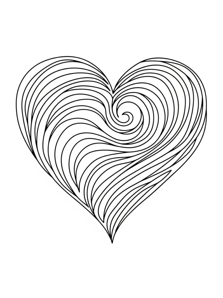 This heart shaped coloring page keeps things beautifully simple with smooth ribbon like lines that swirl inward toward a gentle center curve. The design relies on bold clean outlines and repeated flowing strokes that create a sense of movement without any extra motifs or clutter. Line thickness is consistent and slightly thicker than average, which gives the heart a modern look while still feeling soft and inviting. The open layout makes the shape stand out clearly and keeps the focus on the calming rhythm of the lines.
