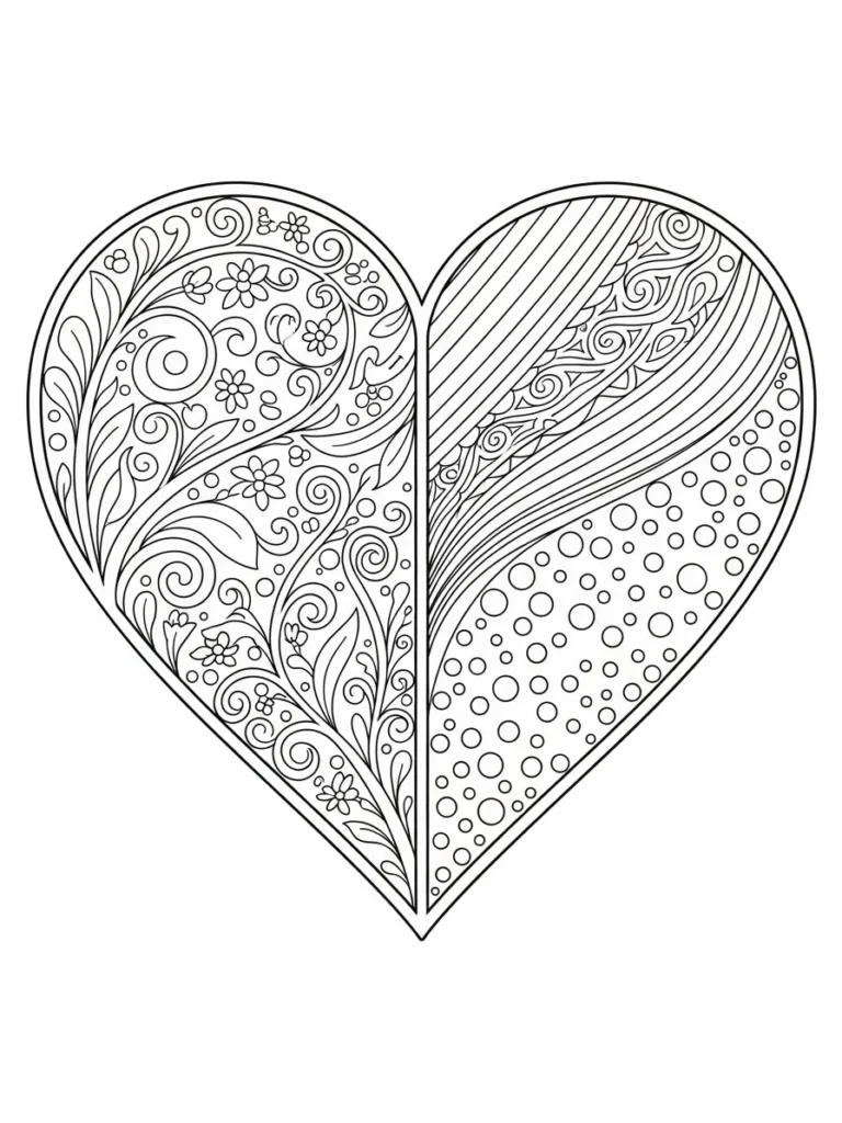 This heart shaped coloring page is divided into two distinct halves, each filled with its own pattern style for a fun visual contrast. One side features flowing florals and leafy swirls, while the other mixes stripes, dots, and curved abstract lines. The line work is crisp and even, making every section clear and satisfying to color. The split layout adds structure while still keeping the overall heart soft and decorative.