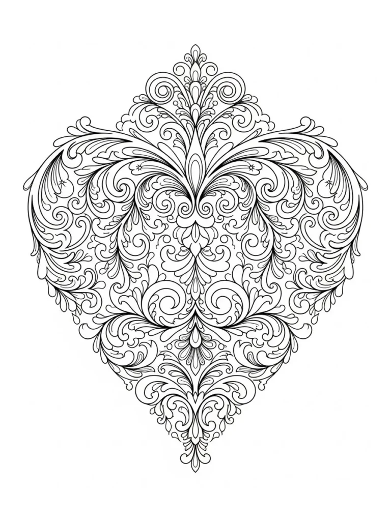 This heart shaped coloring page is filled with rich symmetrical scrollwork inspired by classic ornamental designs. Flowing curls, leaf like flourishes, and layered decorative shapes mirror each other beautifully across the heart, creating a balanced and luxurious look. The line work is fine and precise, with plenty of detailed sections that feel intricate without becoming chaotic. Every curve feels intentional, giving the overall layout a graceful and romantic presence.