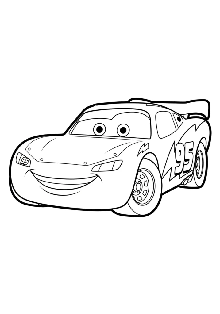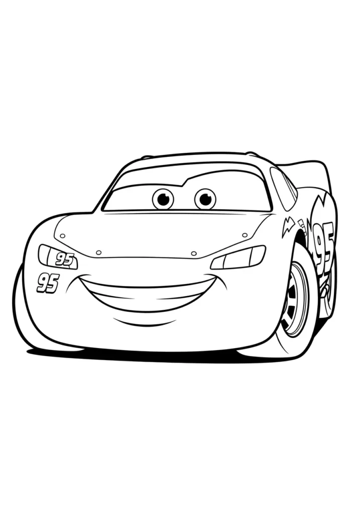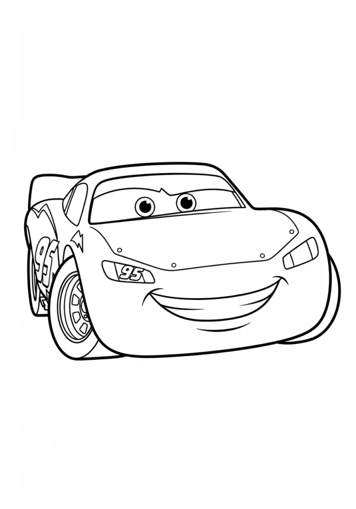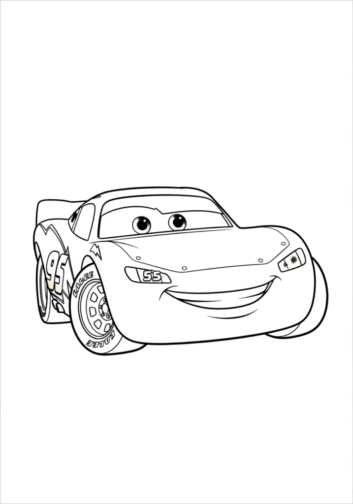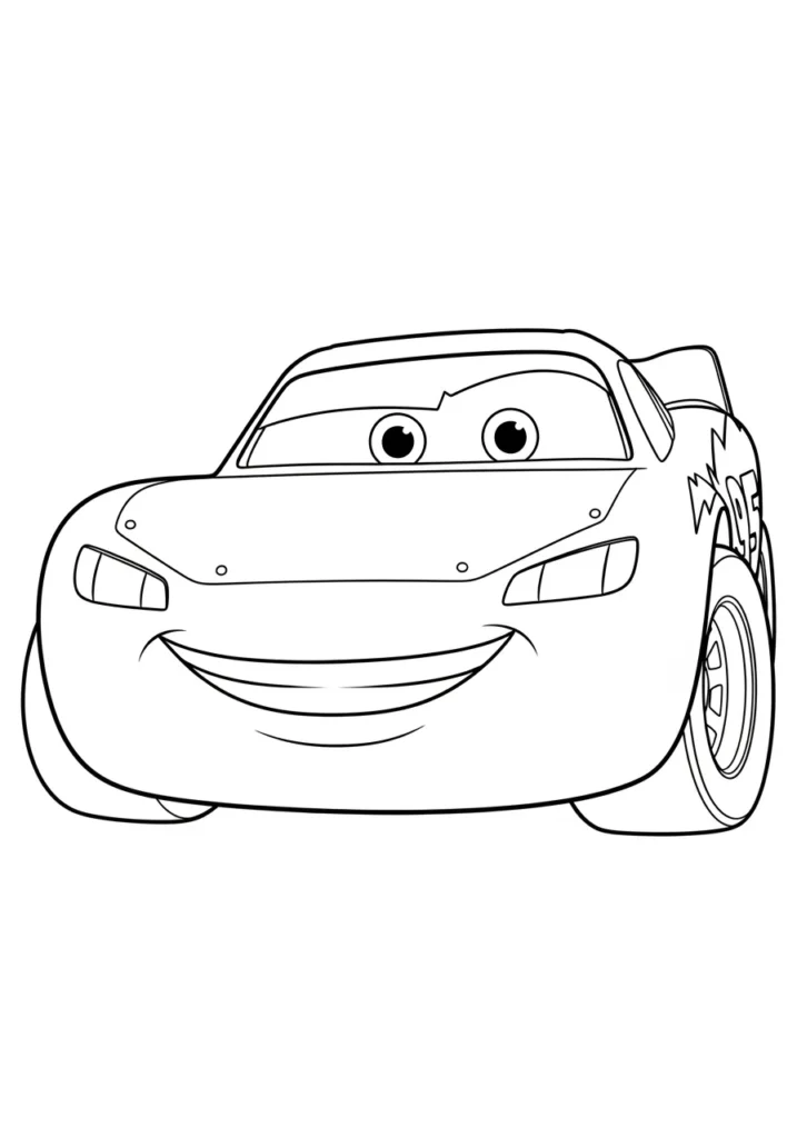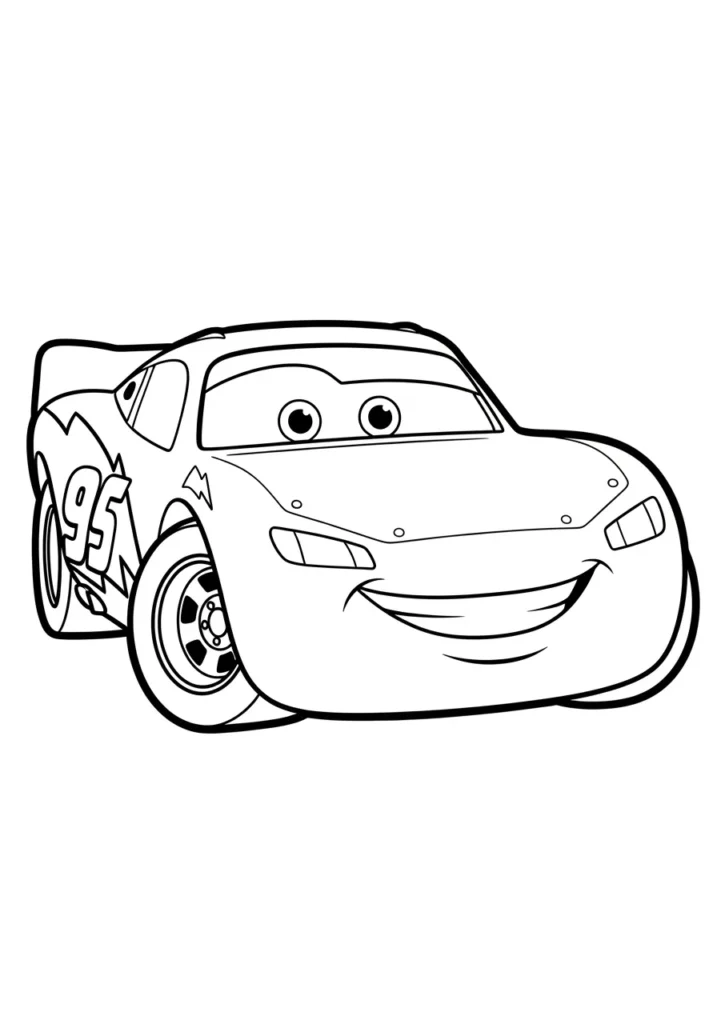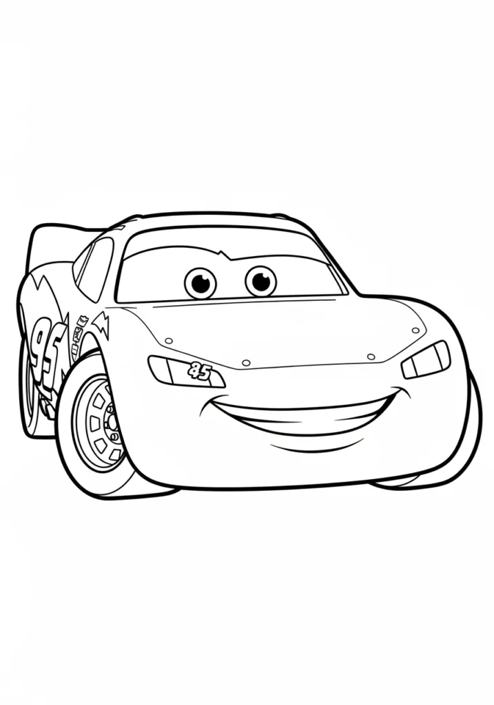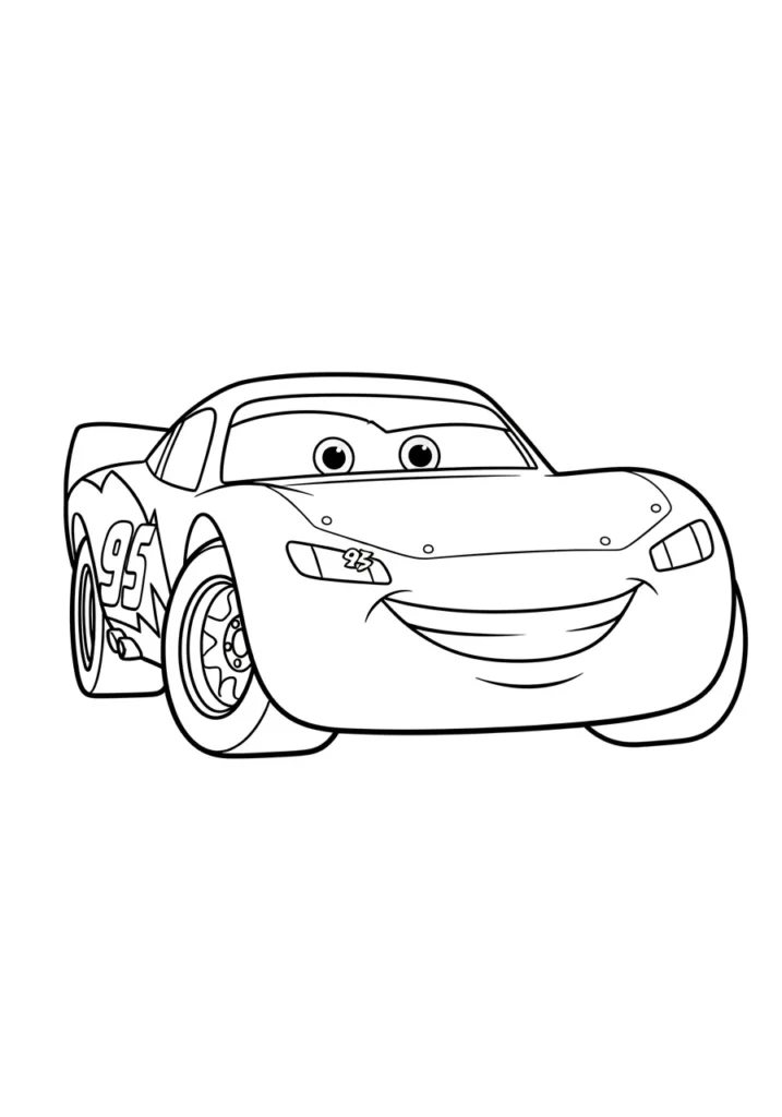 This coloring page captures Lightning McQueen with a confident racing grin and visible side details. The wheels and decals are lightly outlined while the main shapes stay bold and clear. The design feels energetic yet simple enough to enjoy.