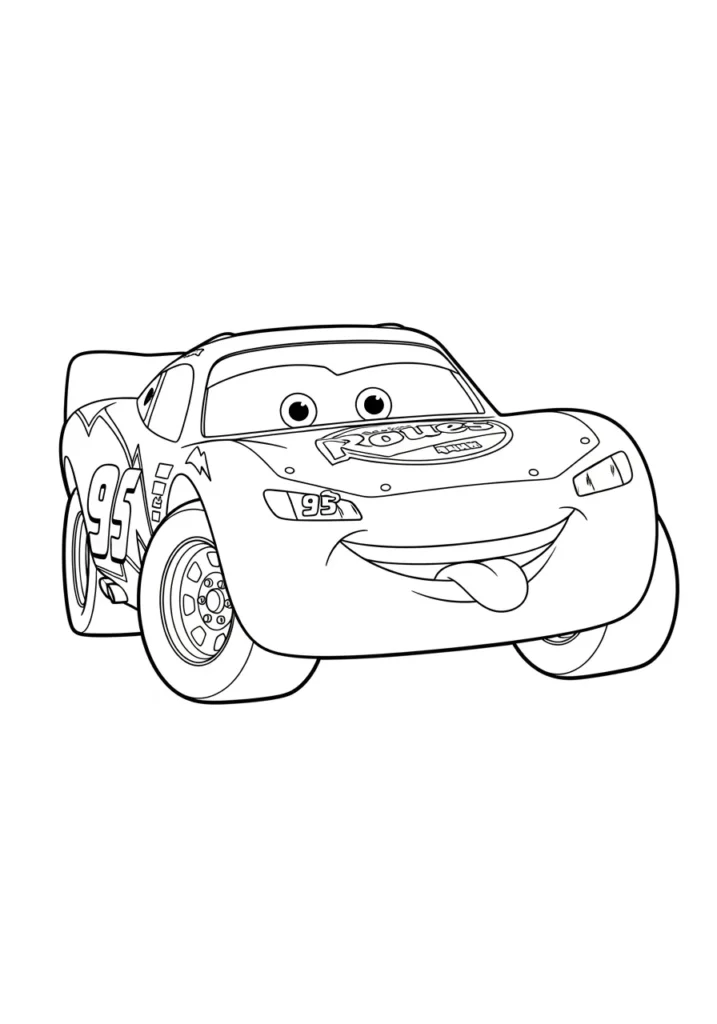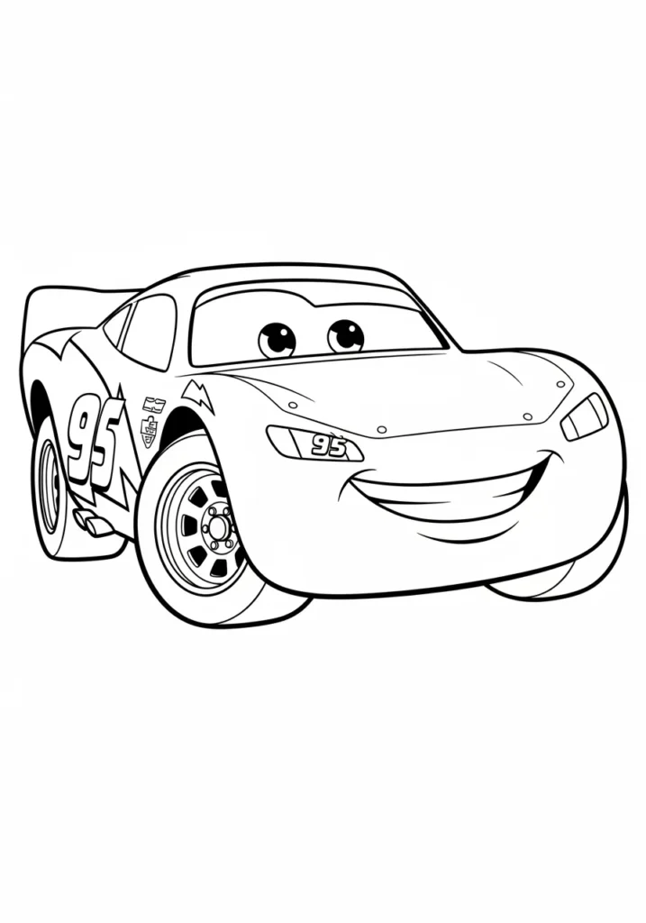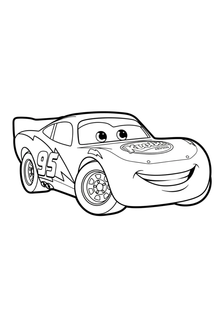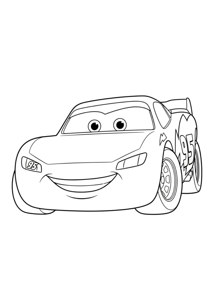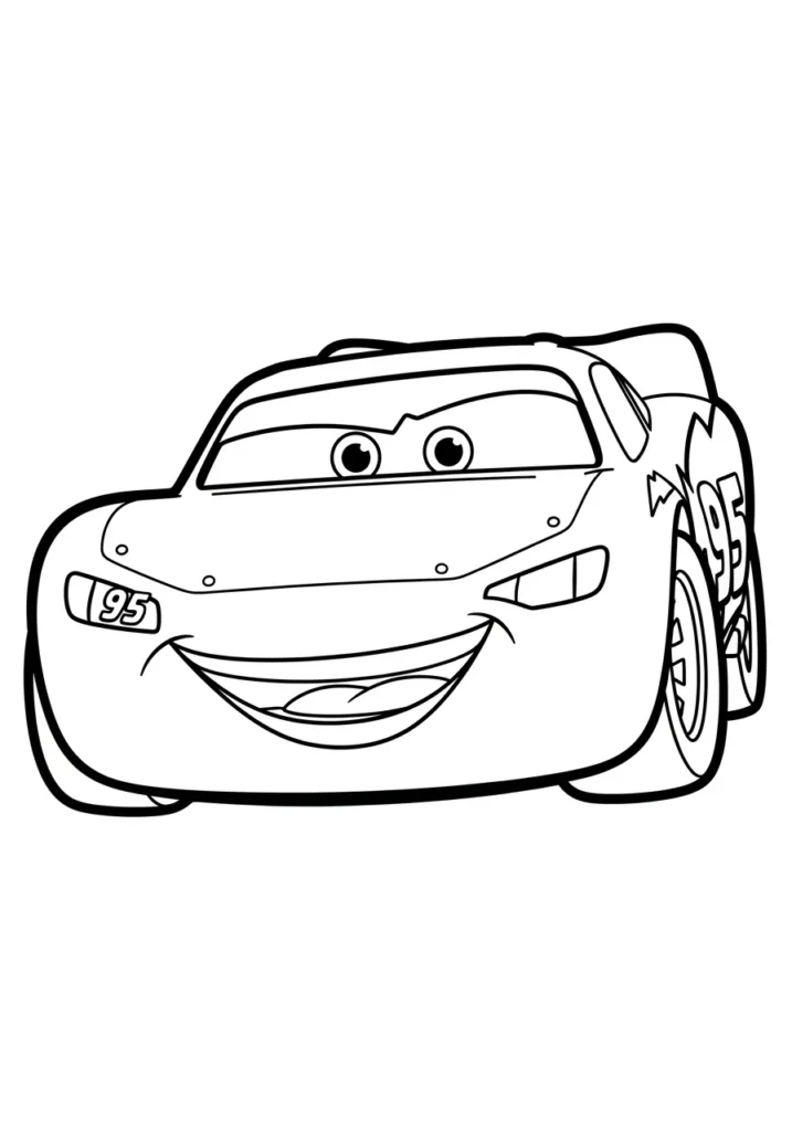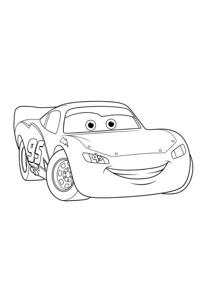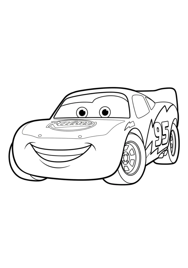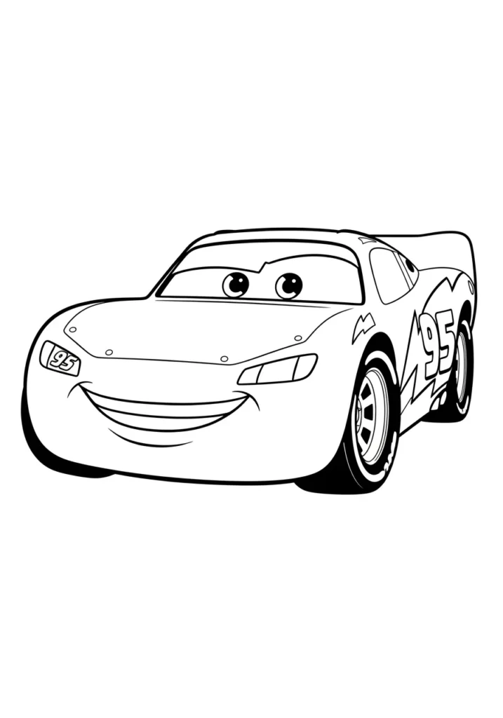This coloring page captures Lightning McQueen with a confident racing grin and visible side details. The wheels and decals are lightly outlined while the main shapes stay bold and clear. The design feels energetic yet simple enough to enjoy.