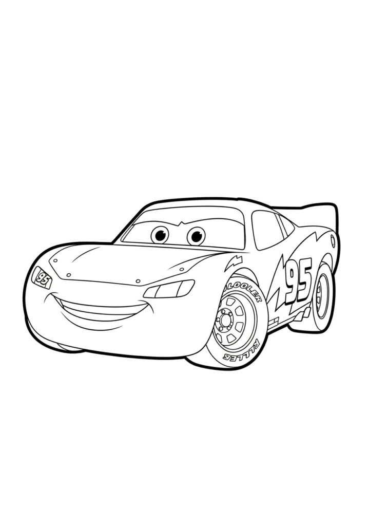 This coloring page shows Lightning McQueen angled more to the side with a classic grin and visible side details like the number and decals. The lines are consistent and slightly thicker which makes the shapes stand out nicely on the page. The design feels simple but still iconic with a clear silhouette and plenty of smooth surfaces to color.