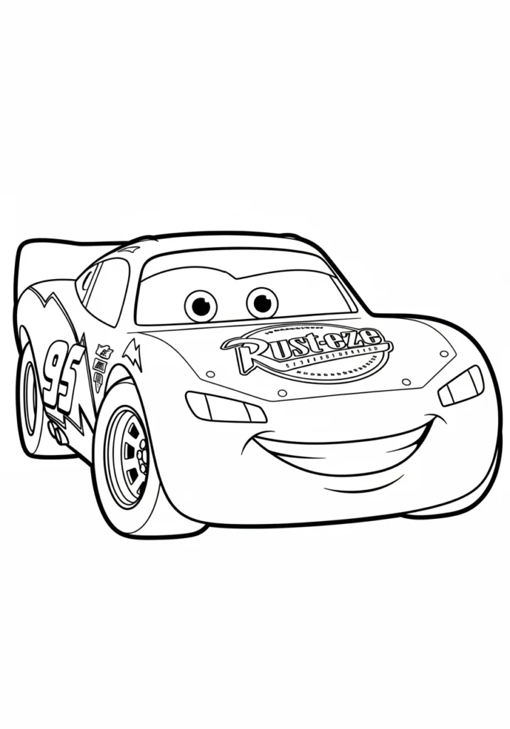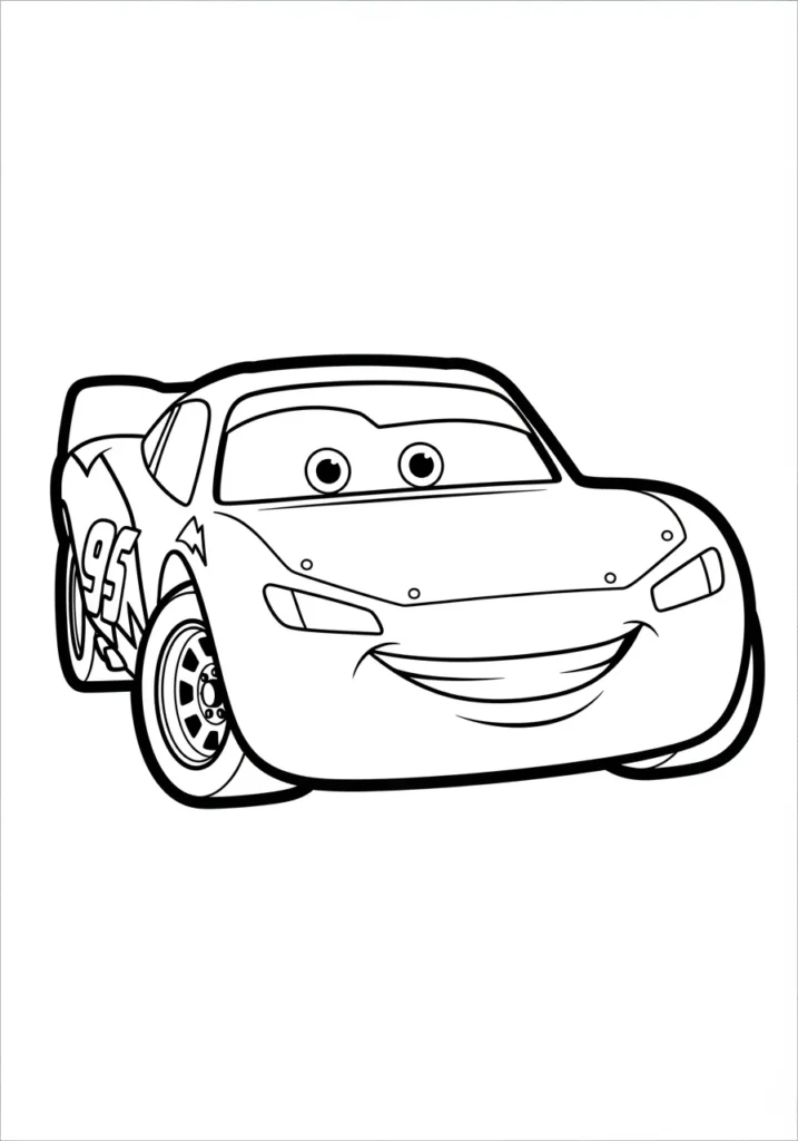 This coloring page focuses on Lightning McQueen’s rounded shape and confident grin with smooth flowing lines throughout the design. The outlines are consistent and slightly thicker which helps everything feel polished and friendly. The details are kept simple so the main character really stands out.